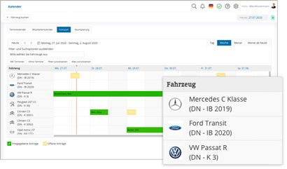 Buchen Sie ein Fahrzeug für den nächsten Außentermin oder eine Geschäftsreise. Im Fuhrpark finden Sie alle nötigen Informationen der zur Verfügung stehenden Fahrzeuge und können diese nach Bedarf problemlos filtern und buchen.