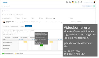 Mit der Raumbuchung in der IntranetBOX können Sie ganz einfach die Belegung Ihrer Räumlichkeiten für z.B. Abteilungen oder Teams planen. Einfach den Raum auswählen und an den zuständigen Mitarbeiter die Prüfung zur Freigabe versenden. Ist die Freigabe an den Mitarbeiter erteilt, erscheint automatisch der Termin im Raumbuchungskalender.